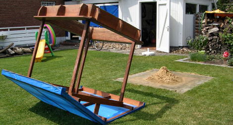 Sehr merkwürdig das. Als wir den Sandkasten aufgebaut haben, war fast bis an den Rand voll Sand. Und nachdem sich eben der Regen verflüchtigt hatte, der Rasen wieder halbwegs trocken war und ich endlich mal die Platten säuberte, stellte ich einen gravierenden Siliziumdioxidverlust fest. Wo ist der bloss hin verschwunden?