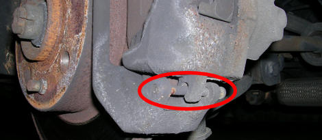Mein Werkstattheber hat irgendwann mal 50 Mark gekostet und kann angeblich 2 Tonnen heben. Jedenfalls macht er einen stabilen Eindruck und kippt den Punto ordentlich schräg. In der Position bekommt man die Räder bequem ab und sieht die Bremsscheibe mit dem Bremssattel frei vor sich. Das schöne bei diesen Bremsen ist, dass man die theoretisch mit ’nem kleinen Schraubenzieher wechseln kann. In der Praxis braucht man noch eine Zange, einen kleinen Dorn und einen kleinen Hammer. Mit dem Schraubenzieher zieht man einen Sicherungsstift aus dem kleinen Haltebolzen.