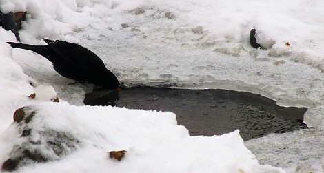 Unser Vogelhäuschen vor dem Wohnzimmerfenster wird von den kleinen gefiederten Freunden nicht so angenommen, wie ich es mir gedacht habe. Zumindest sehe ich da nie ein Tierchen dran. Am Teich allerdings ist das anders. Dort wo der Wassersprudler den kleinen See eisfrei hält, tummeln sich alle möglichen Vögel, um sich mit Wasser zu versorgen.