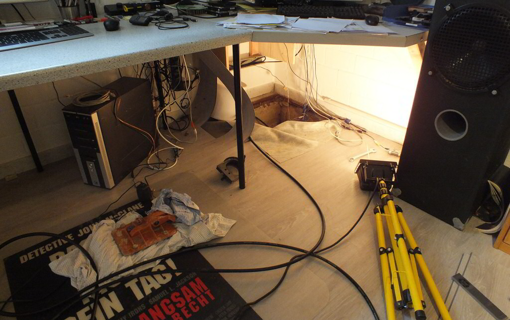 Die Waschmaschine war an und pumpte Wasser ab. Versuchte sie jedenfalls, klappte auch, nur lief das Wasser nicht im Ausguss ab, sondern verteilte sich im Keller. So eine Kacke! Schnell die Scheißespirale aus dem Arbeitskeller geholt und in den Abfluss gepfriemelt. Konnte ich aber bis zum Anschlag ohne Widerstand versenken. Da war’s also nicht verstopft. Eine Revisionsöffnung ist mir bekannt … im neuen Arbeitszimmer in der Ecke unter den Schreibtischen, wo die PCs stehen. Ganz super!