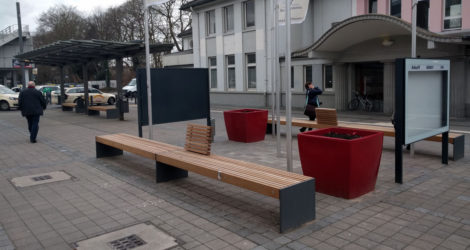 Ich vermute übrigens, man hat genau diese Anlehnbügel ausgewählt, damit sie zu den Bänken passen, die wir damals für die Innenstadt nicht ausgewählt haben und von denen ein zwangsweise gekauftes Musterexemplar bereits vor dem Rathaus aufgestellt wurde. Diese zieren nun auch den Bahnhof. Vor dem Hintergrund einer einheitlichen Möblierung sieht das natürlich gut aus. Leider gefallen mir als ADFCler und Fahrradfahrer die Bügel halt nicht. Aber was weiß ich schon …