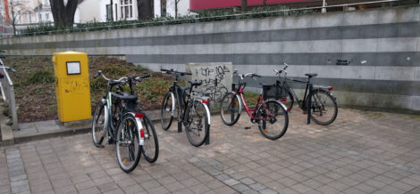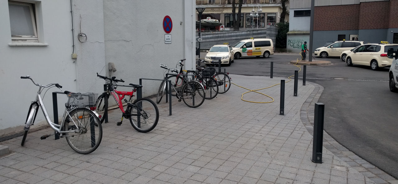 Rechts neben der (immer noch) mit Rädern zugeparkten Rampe zum Bahnhofsvorplatz sind einige Anlehnbügel montiert. Natürlich nicht die, welche der ADFC empfiehlt, sondern stylishere, die nach wenigen Wochen zugesifft sind und leichter den Lack der angelehnten Räder beschädigen. Genau die Dinger, die auch vor dem Rathaus montiert sind. Sei’s drum, sie werden schon genutzt.