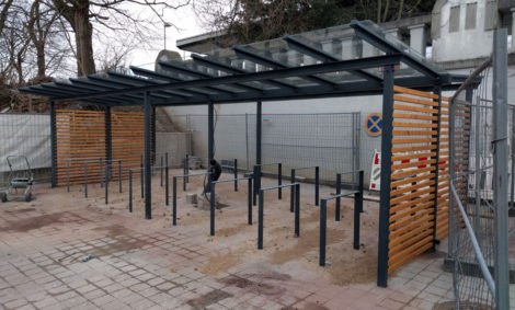 Auch auf der linken Seite des Bahnhofsgebäude sind Abstellanlagen aufgestellt. Auch hier ist es offensichtlich so, dass Infrastruktur genutzt wird, sobald sie angeboten wird. Obwohl dort noch gebaut wird, sind die ersten Räder bereits angeschlossen.
