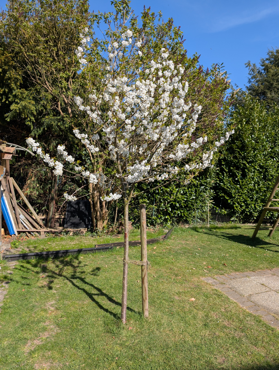 Ein kleiner Sauerkirschbaum in voller Blüte steht auf einer Rasenfläche vor einem grünen Hintergrund aus Büschen und Bäumen.