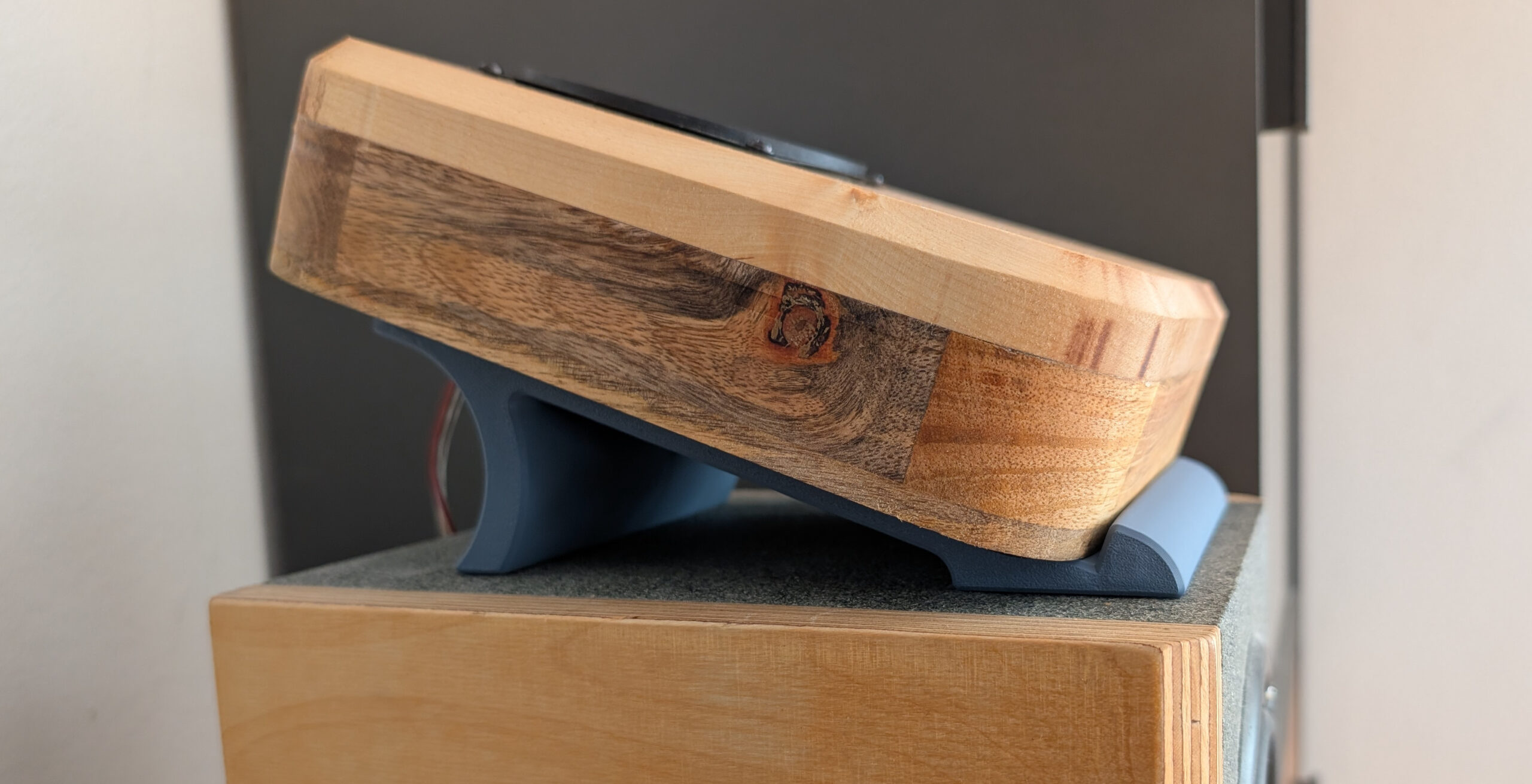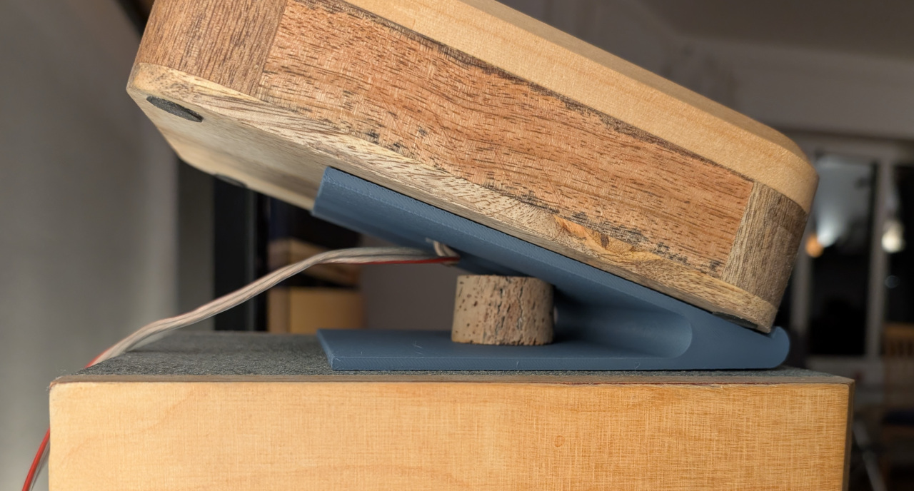 In der Schule lernt man „Ausfallwinkel gleich Einfallwinkel“ – zumindest bei Licht. Bei Schall ist es ähnlich, aber etwas diffuser. Zum Einen strahlt der Lautsprecher nicht so gerade ab wie ein Laser (oder ein einzelner Lichtstrahl) und zum anderen ist die Raufasertapete an der Decke kein Spiegel. Daher habe ich direkt nach dem Bau einfach einen kleinen Korkklotz unter die Hinterseite der Lautsprecher gelegt, um eine Abstrahlung schräg nach vorne zu erzielen. Allerdings war das etwas wackelig und behelfsmäßig. Daher habe ich Nachwuchs 1.0 gefragt, ob er mit seinem 3D-Drucker eine kleine 20°-Rampe drucken kann. Hat er auch fix umgesetzt! Die erste Version hatte mir aber zu kurze Schenkel und aufgrund der stylishen Tatsache, dass sie hinten keine Stütze hatte, war es auch etwas wackelig. Nachdem ich den Korkklotz in das Dreieck geklemmt habe, war es etwas stabiler. Aber mit den gedruckten Haltern sollte das Konstrukt ja gerade nicht gebastelt aussehen.