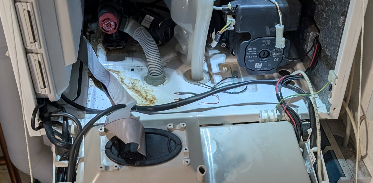 Kleine Schalter hatte ich neulich bei Amazon bestellt und heute Morgen hat Nachwuchs 1.0 kleine Klingeldrähte und eine Brücke an den Kippschalter gelötet. In seinem studentischen Hilfsjob im Heinz-Nixdorf-Museum standen in den letzten Wochen u.a. Lötkurse auf dem Programm und er betreut diese. Da ist es hilfreich, wenn er es auch kann ;-) und es sich vorher aneignet. Mit diesem Wissen, hat er mir was voraus und dann darf er gerne auch hier Hand anlegen. Hat im OBI noch schnell eine „dritte Hand“ und Lötzinn gekauft und 10 Minuten später waren die sechs Lötstellen sauber versorgt. Alles angeklemmt und … die Therme läuft an. Allerdings in der „falschen“ Position des Schalters. Ein Blick ins Internet (ein Schaltbild hatte der Chinese nicht mitgeschickt) brachte Klarheit. Die Stellung war um 180° anders als wir es vermuteten. Passt also alles. Kleines Loch ins Gehäuse gebohrt (naja, zwei, weil ich beim ersten Mal nicht richtig geguckt habe), den Schalter eingefädelt und nun kann der Schornsteinfeger oder Gelsenwasser ganz bequem die Betriebsart umschalten.