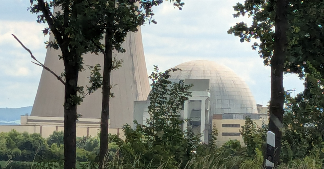 Zwischen Bäumen erkennt man einen Teil eines Kühlturms und die Kuppel über dem Reaktor des Kernkraftwerk Grohnde.