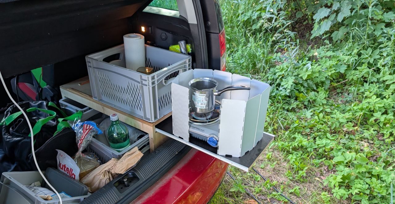 Blick in den unaufgeräumten Kofferraum eines Skoda Yeti in dem ein kleines Holzregal mit Kunststoffkisten zu sehen ist. Auf einem kleinen Auszug steht ein Gastkocher mit einem Topf Wasser.