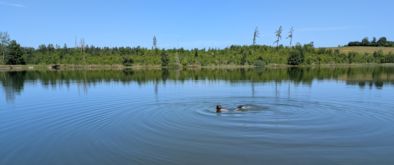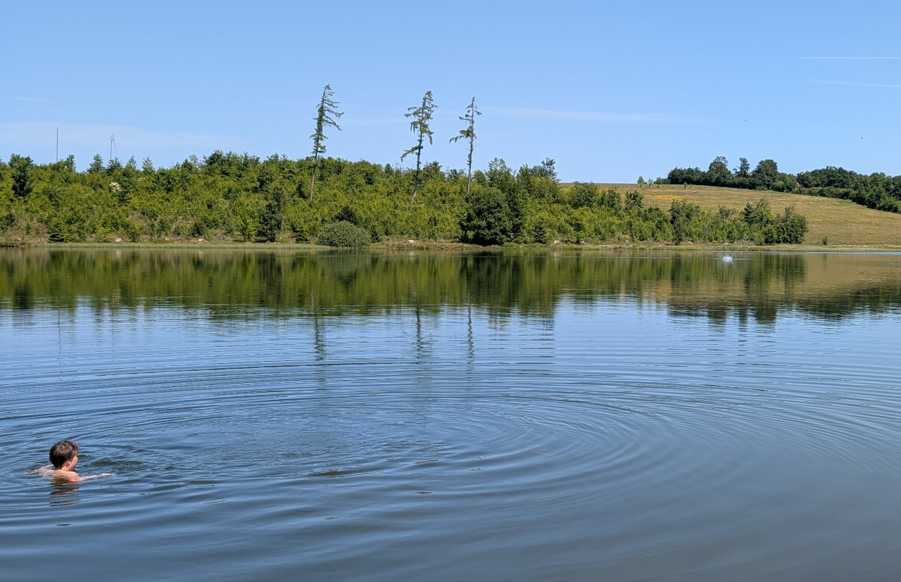 Ein Junge schwimmt in einem blauen See unter einem komplett blauen Himmel. Am gegenüberliegenden Ufer sieht man einige Büsche.